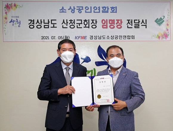 5일 소상공인연합회 경남도연합회는 산청군청을 찾아 제1대 경남도산청군연합회장으로 임명된 조성환 지산농산 대표에게 임명장을 전달했다.