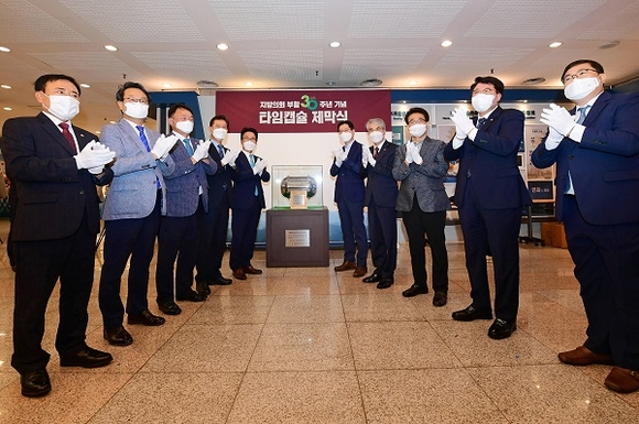 그리고 지난 30년의 도의회 역사를 기념하고 새로운 지방자치 시작의 의지를 다지기 위해 타임캡슐을 제작해 의회소식지 창간호, 1대부터 11대까지의 기록인 다큐 동영상, 민생현상을 누비며 도민과 소통한 의정활동사진 등 20점과 도의원과 사무처 직원들이 도의회의 미래상을 적은 소망메시지를 타임캡슐 안에 넣어 봉인한 후 제막하는 세리머니가 펼쳐졌다.