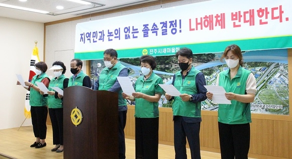 진주시 새마을회는 15일 오전 시청 브리핑룸에서 '지역민과 논의 없는 졸속 결정! LH 해체 수준 개혁안 절대 반대'를 주장하는 성명을 발표했다.
