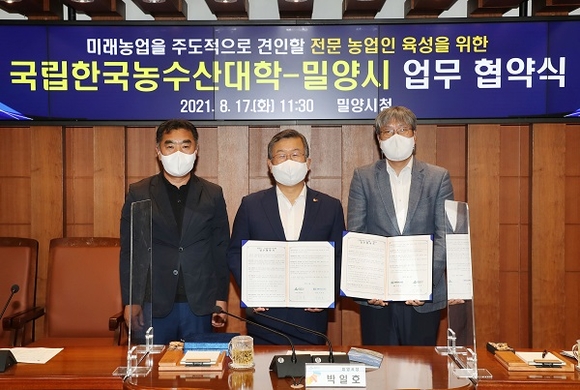 경남 밀양시는 17일 시청 소회의실에서 미래 농업을 주도적으로 견인할 전문 농업인 육성과 농업인의 소득 증대를 통한 삶의 질 향상을 위해 국립한국농수산대학(한농대)과 업무협약을 체결했다고 밝혔다.