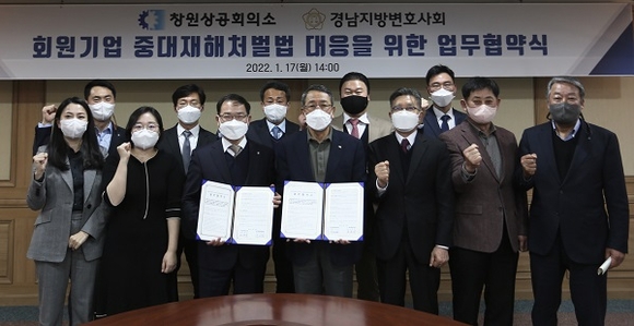 창원상공회의소와 경남지방변호사회가 17일 오후 창원상의 3층 의원회의실에서 '중대재해처벌법 대응을 위한 업무 협약'을 체결했다.