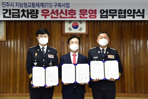 경남 진주시와 진주경찰서, 진주소방서는 20일 진주소방서 회의실에서 '긴급차량 우선신호 시스템' 운영을 위한 업무협약을 체결했다.