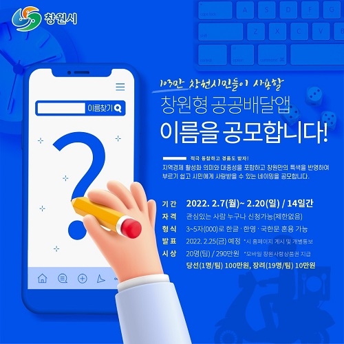 정현섭 경제일자리국장은 “소상공인의 배달앱 수수료, 광고비 절감과 코로나19로 인해 계속되는 부담을 경감시키고자 창원형 공공배달앱을 준비하고 있다”며 “네이밍 공모전에 많은 시민들이 참여하여 창원을 대표하는 공공배달앱이 되기를 기대한다”고 말했다.