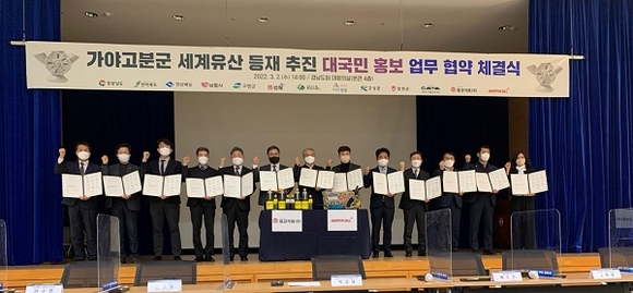 김해시는 가야고분군 세계유산 등재 추진 관련 10개 지자체, 가야고분군세계유산등재추진단과 함께 2일 경남도청 대회의실에서 ㈜해피콜, 몽고식품(주)과 홍보 업무협약을 체결했다.