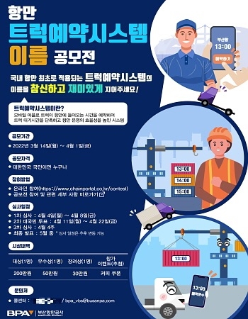 대상작으로 선정된 이름은 향후 ‘차량 반출입 예약시스템’의 공식 명칭으로 사용될 예정이다. 공모전에 대한 더 자세한 사항은 ‘부산 항만 트럭 예약시스템’ 공모전 사이트를 참고하거나 BPA 담당자 이메일로 문의할 수 있다.