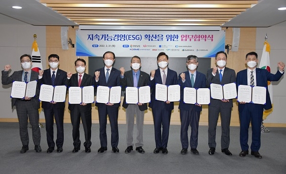 경남도는 31일 도청 도정회의실에서 한국생산성본부, (주)나이스디앤비, 경남상공회의소협의회 등 8개 기관과 '2022년도 경남형 지속가능경영 확산을 위한 ESG 지원사업' 업무협약을 체결했다.