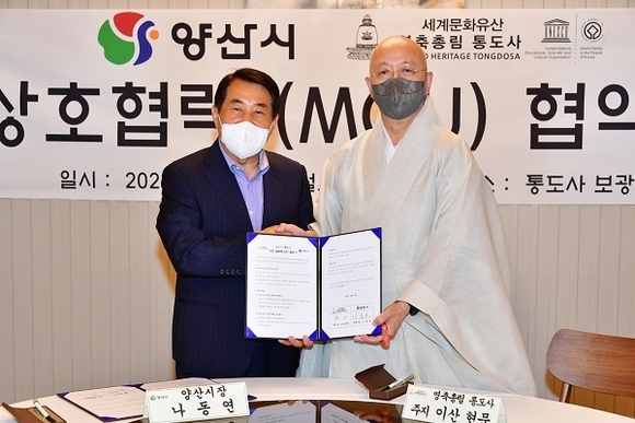 경남 양산시와 통도사는 22일 지역 상생발전을 위한 상호협력 업무협약(MOU)을 체결했다.
