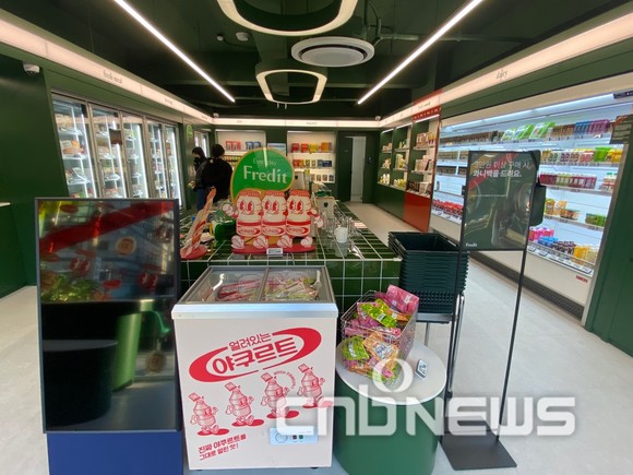 또 야쿠르트와 야쿠르트 스티커를 집어든 뒤 셀프 키오스크에서 직접 결제도 해봤다. 제품 가격표에는 전자 가격표가 부착돼 프레딧몰에 실제로 등록된 리뷰 개수 및 평점을 확인할 수 있어 제품 선택이 한결 수월했다. 일부 제품의 경우 상품이 만들어지는 과정이 담긴 동영상도 매장에서 확인 가능해 신뢰가 갔다.