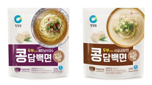 5일 대상그룹에 따르면, 두부로 만든 콩담백면 2종은 △베트남식 국수 △사골곰탕면 등 2종으로 베트남식 국수는 정통 베트남 하노이식으로 양지를 오랜 시간 푹 끓여내 국물 맛이 깊고 진하다. 여기에 레몬그라스·스타아니스·계피·후추 등 향신료를 사용해 이국적인 향미를 그대로 살려 현지의 맛을 구현했다.