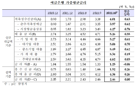 이런 가운데 예대금리차는 더 벌어지고 있다. 국내 은행들의 10월말 잔액 기준 총수신금리는 연 1.92%, 총대출금리는 연 4.38%로 각각 전월 대비 0.26%포인트 올랐다. 총대출금리와 총수신금리 차 즉, 국내 은행의 평균 예대금리차는 3분기 말 잔액 기준 2.46%포인트로 2014년 2분기 2.49%포인트 이후 8년 만에 최대 수준이었다. 예대금리차는 2020년 12월에 2.05%포인트, 2021년 12월 2.21%포인트였다.
