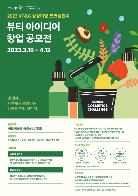 KT&G(케이티앤지)가 친환경 뷰티 분야의 창업지원을 강화하기 위해 ‘2023 KT&G 상상마당 코코챌린지’ 공모를 진행한다고 16일 밝혔다.