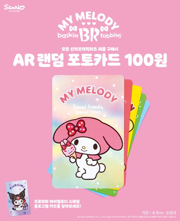 6일 배스킨라빈스에 따르면, 산리오캐릭터즈 AR 랜덤 포토카드는 MZ세대 사이에서 인기 있는 산리오의 대표 캐릭터를 3D 형태의 AR 콘텐츠로 체험할 수 있는 굿즈다. ‘마이멜로디’ ‘쿠로미’ ‘시나모롤’ 등 다양한 산리오캐릭터즈로 구성된 시즌별 공통 카드 20종과 각 시즌에 한해 만날 수 있는 한정 카드 11종으로 제작돼 수집의 재미를 더했다.