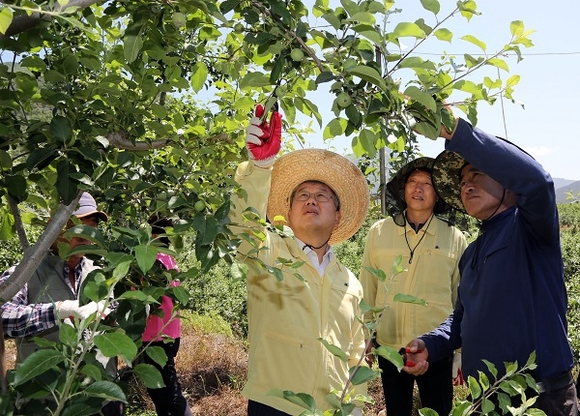 이날 작업현장에는 박일호 시장과 농업기술센터 직원들이 참여해 사과 적과 작업을 하며 구슬땀을 흘렸다.