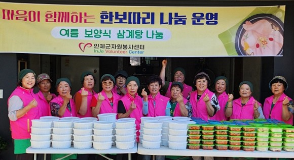 △ 인제군자원봉사센터와 인제읍새마을부녀회는 7일 센터에서 지역 저소득어르신의 건강 상차림으로 삼계탕과 반찬을 만들어 70가구에 전달했다.
