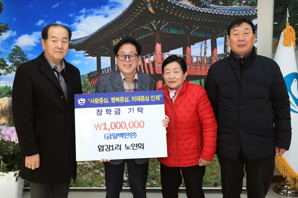 인제읍 합강1리 경로당(회장 김태완)는 최근 인제군청을 방문해 지역 인재양성을 위해 써 달라며 장함금 100만원을 기탁했다.