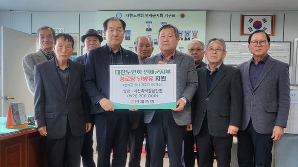 △ 인제축협(조합장 이택열)은 26일 대한노인회 인제군지부(회장 김양준)를 방문해 지역내 마을경로당 89곳에 2670만원 상당의 난방유를 지원했다.