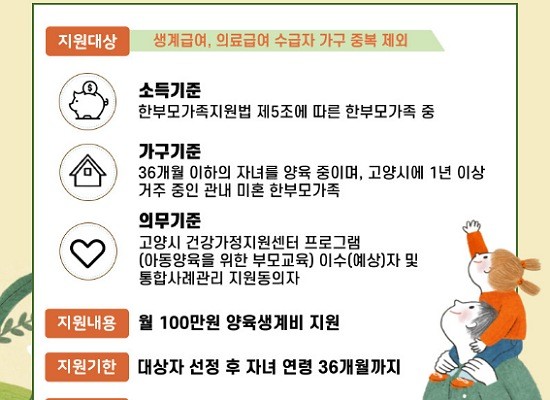 고양시는 전국 지자체 최초로 36개월 이하의 어린 자녀를 양육 중인 미혼 한부모가족에게 매월 100만 원의 양육생계비를 지원한다. 양육생계비뿐 아니라 아동 양육을 위한 부모 교육과 심리 상담을 고양시 건강가정지원센터와 연계해 제공하고, 통합사례관리 대상으로 선정해 복합적인 문제와 요구를 파악하는 등 맞춤형 서비스를 지원 중이다.