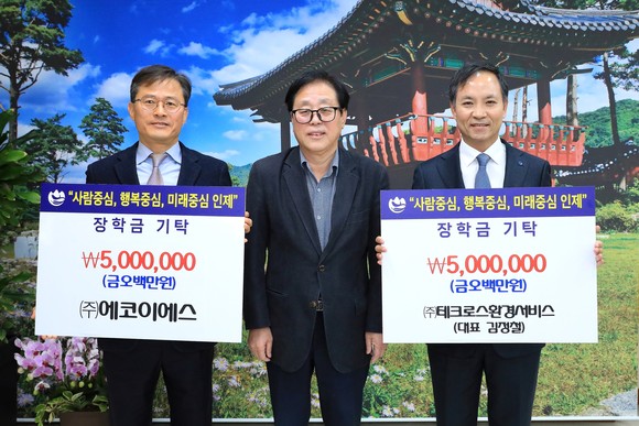 에코이에스(대표 이성일)와 테크로스환경서비스(대표 김정철)는 최근 인제군청을 방문해 지역 인재 양성을 위해 써 달라며 각각 장학금 500만원을 기탁했다.