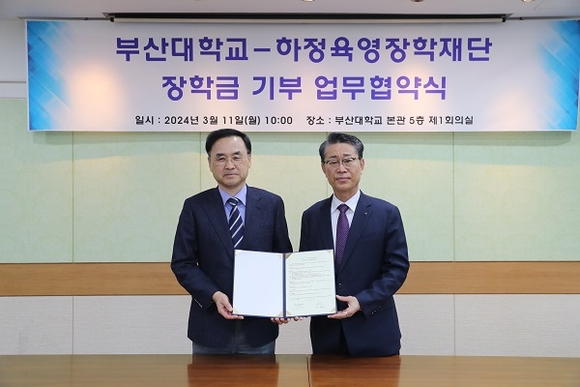 부산대학교는 재단법인 하정육영장학재단과 11일 오전 교내 대학본부 5층 제1회의실에서 우수 인재 양성을 위한 장학금 기부 협약을 체결했다.