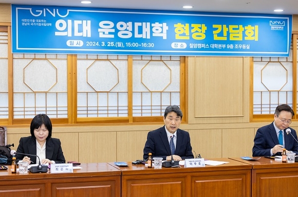오후 3시 칠암캠퍼스 대학본부 9층 조우동실에서 열린 간담회는 부총리 모두 말씀에 이어 보건복지부 장관과 경남도지사의 인사 말씀, 권순기 총장의 환영 인사로 진행됐다. 이어 대학 학사관리 및 의대 증원 대비 계획 보고, 자유 토의 등의 순으로 진행됐다.