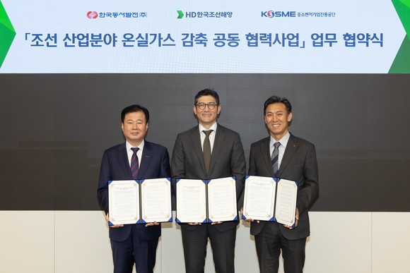 HD한국조선해양이 21일 한국동서발전·중소벤처기업진흥공단과 ‘조선 산업 분야 온실가스 감축 공동 협력사업을 위한 업무협약’을 체결했다.