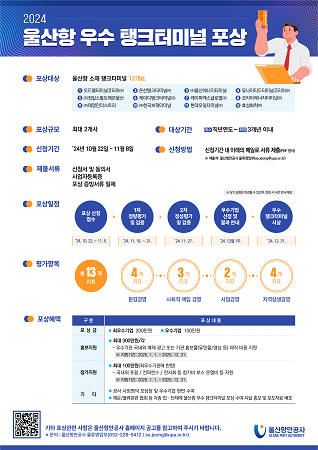울산항만공사(UPA)는 울산항의 주력화물인 액체화물의 글로벌 경쟁력을 강화하기 위해 다음달 8일까지 ‘2024년 울산항 우수 탱크터미널 포상’ 신청을 받는다고 22일 밝혔다.
