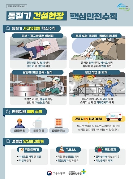 특히 겨울철에는 낮은 기온과 건조한 환경으로 현장에서 화재‧폭발, 붕괴, 중독‧질식 등 사고가 발생할 가능성이 높아 사업장의 예방 조치사항을 중점적으로 확인하고 지도한다. 또한 옥외작업을 하면서 발생할 수 있는 한랭질환(저체온증, 동상 등)을 예방하기 위한 3대 기본 수칙도 안내한다.