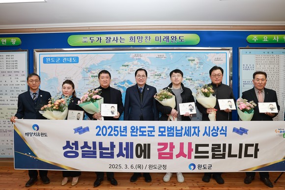 완도군(군수 신우철)은 지난 6일 지방세를 성실하게 납부해 건전한 납세 문화 조성에 앞장선 모범 납세자 5명(법인 1명, 개인 4명)에게 표창패와 모범 납세자 증서를 수여했다.