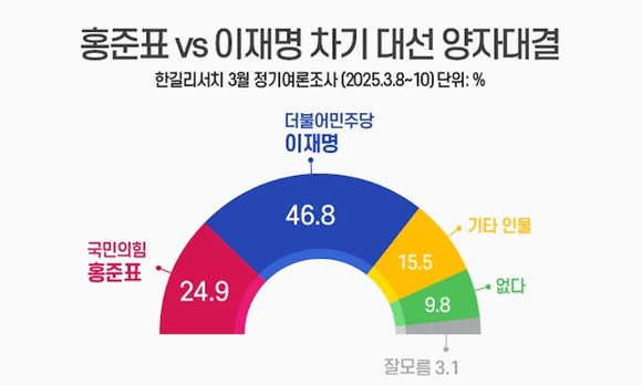 그리고 같은 조사에서 ‘이재명·홍준표 양자 대결’에 대한 질문에는 이 대표와 홍 시장이 각각 46.8%, 24.9%를 얻어 양측의 차이는 21.9%p로 오차범위 밖이었으며, 나머지 응답은 ‘기타 인물’ 15.5%, ‘없음’ 9.8%, ‘잘 모름’ 3.1%로 나타났다.