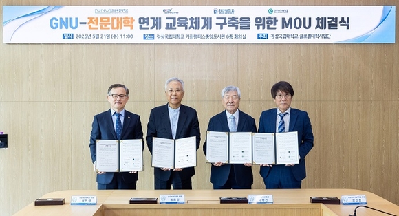 경상국립대학교는 글로컬대학30 사업의 성공적인 추진과 지역사회 발전을 위해 지난 21일 오전 가좌캠퍼스 중앙도서관 6층 회의실에서 동원과학기술대학교, 마산대학교, 진주보건대학교와 글로컬대학사업 지원 및 참여를 위한 다자간 업무협약(MOU)을 체결했다고 22일 밝혔다.