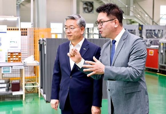 김종호 기보 이사장(왼쪽)이 정웅용 (주)광원이엔지 대표와 함께 제조시설을 둘러보고 애로사항을 청취하고 있다.(사진=기보 제공)