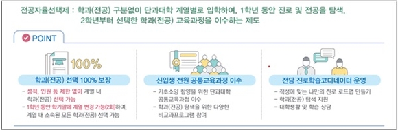 전체 모집인원의 62.7%를 계열모집(전공자율선택제)으로 모집하며, 1학년 동안 2번 계열을 바꿀 수 있는 기회를 제공하고, 성적, 인원 제한 없이 100% 학생이 원하는 학과(전공) 선택이 가능하기에 전공자율선택제에 적극적으로 지원하는 것을 추천한다.