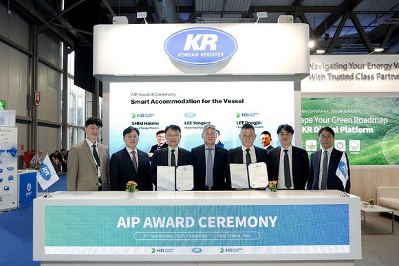 한국선급(KR)이 9일(현지시간) 밀라노에서 열린 가스텍(Gastech) 전시회에서 HD 현대삼호와 HD 현대미포가 협력해 개발한 사물인터넷(IoT) 기반 스마트 선실(Smart Accommodation System)에 대해 개념승인(AIP, Approval in Principle)을 수여했다.