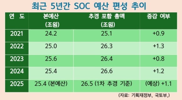 이에 정부는 최근 내년 SOC 예산을 전년 대비 2조원(약 8%) 증액한 27조 5000억원으로 편성했다. 건설업계가 요구해온 30조원에는 미치지 못하지만, 업계는 그나마 안도하는 분위기다. 대한건설협회는 “공사비 급등, PF 부실 등으로 어려움을 겪고 있는 건설업계에 도움이 될 것”이라며 환영의 뜻을 밝혔다.