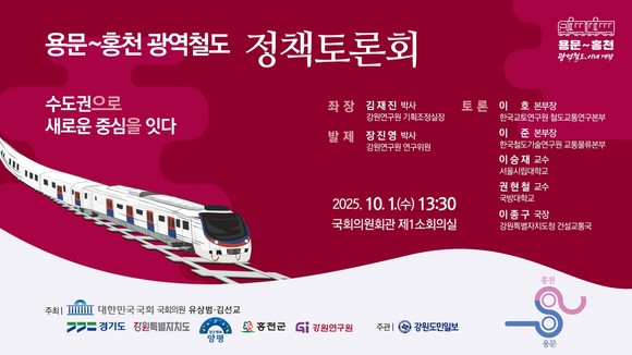 1일 오후 1시 30분 국회의원회관에서 열리는 이번 토론회는 홍천군, 양평군의 오랜 숙원인 철도 연결 문제를 다루며, 용문~홍천 광역철도 사업의 필요성과 파급효과를 집중적으로 논의한다.