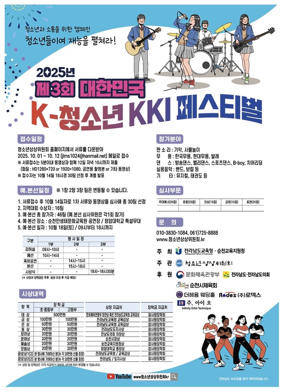 청소년상상위원회(대회장 이상대)가 개최하는 '2025년 제3회 대한민국 K-청소년 끼 페스티벌'이 오는 10월18일(토) 오전 10시부터 18시까지 순천만생태문화교육원 공연장에서 펼쳐진다고 전했다.
