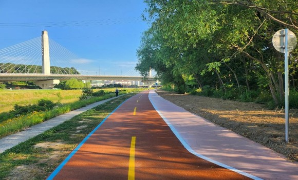 이곳은 폭이 좁고, 보행자와 자전거 길이 명확히 구분되지 않아 사고 위험이 제기돼 왔다. 이에 광산구는 도로 폭을 3.9m~5m로 대폭 넓혀 자전거가 달리는 길과 산책길을 분리하고, 자전거도로를 정비했다.