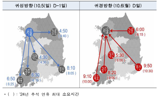 귀성은 ▲서울→대전 4시간 30분 ▲서울→부산 8시간 10분 ▲서울→광주 6시간 30분 ▲서울→목포 6시간 50분 ▲서울→강릉 4시간 50분이 소요되고, 귀경은 ▲대전→서울 5시간 30분 ▲부산→서울 9시간 50분 ▲광주→서울 8시간 20분 ▲목포→서울 9시간 10분 ▲강릉→서울이 6시간 정도로 예상된다.