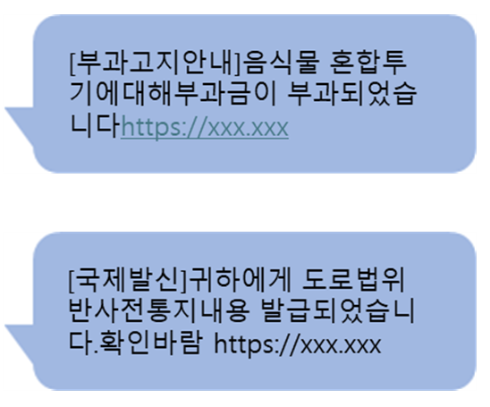추석 명절을 맞아 친지방문을 위한 교통량 증가와 음식물 쓰레기 배출이 증가하는 상황을 악용해 정부·지자체를 사칭한 범칙금·과태료 부과 스미싱 문자 등에 속지 않도록 주의해야 한다.