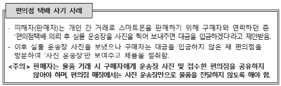 또한, 개인 간 거래 과정에서 구매자가 제품을 절취하는 ‘편의점 택배 사기’가 새로운 피해 유형으로 확인되고 있다