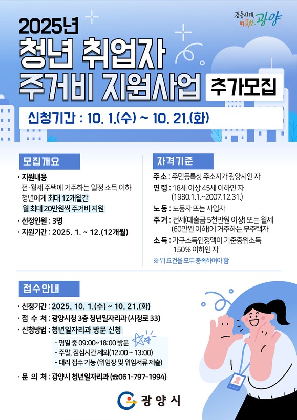 광양시는 청년들의 주거 안정을 위해 10월 1일부터 21일까지 ‘2025년 청년 취업자 주거비 지원사업’ 추가 모집을 진행한다고 밝혔다.