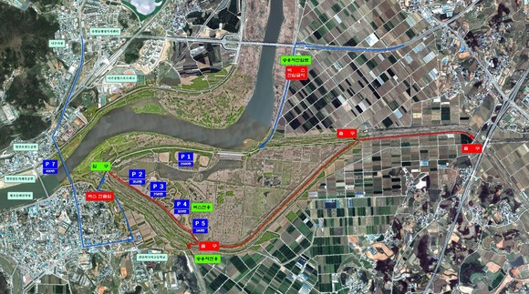 축제장에서 나가는 길은 제 1주차장의 경우 입구 반대편 출구를 이용해 물넘이 구간 삼거리로 진입해 제방도로나 영산천 방향으로 빠져나가면 된다. 또 축제장이나 인근 임시주차장 이용 차량이 행사장에서 나올 때는 영산천이나 전남외국어고교 방향으로 빠져나가도록 했다.