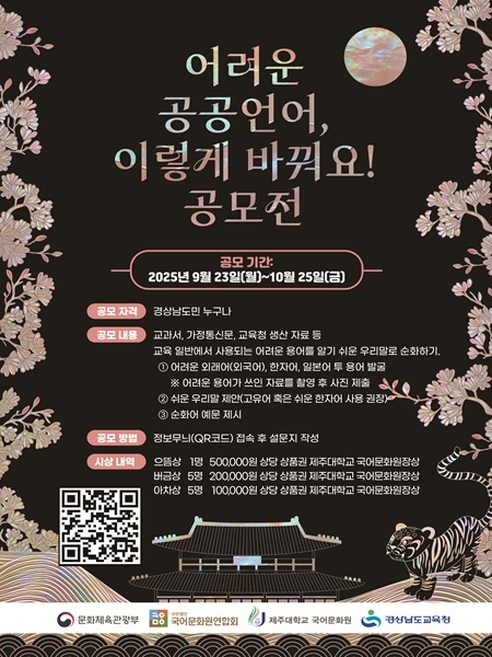 한편 경남교육청은 문화체육관광부와 (사)국어문화원연합회에서 공모한 '2025년 국어책임관 활성화 지원 사업'에 전국 시·도교육청 가운데 유일하게 선정됐다. 이에 제주대 국어문화원과 협력해 어려운 교육 용어 순화 공모전, 민원 서식 개선, 직원 대상 공공언어 교육 및 홍보 활동을 적극적으로 추진하고 있다.