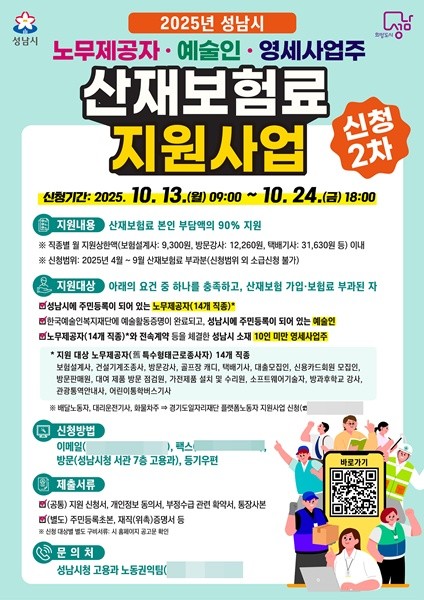 성남시는 오는 13일부터 24일까지 노무제공자와 예술인 등 노동취약계층을 대상으로 산재보험료 지원사업의 하반기 접수를 진행한다.