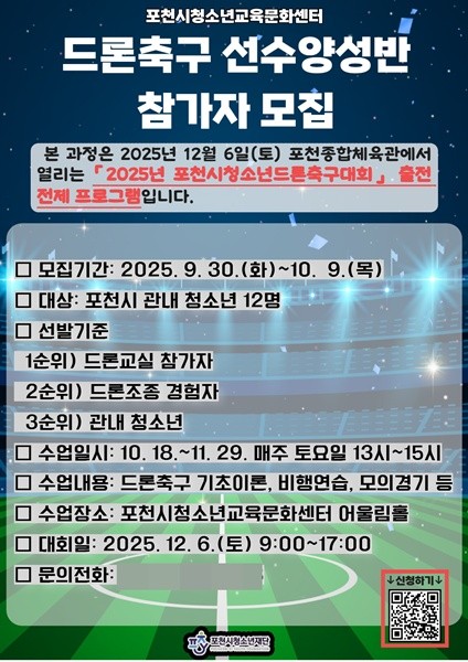 이번 프로그램은 오는 12월 6일 포천종합체육관에서 열리는 ‘2025년 포천시 청소년드론축구대회’에 출전할 선수를 발굴·육성하기 위해 마련했다. 참가 청소년들은 드론축구 기초이론, 비행 연습, 모의 경기 등 체계적인 훈련 과정을 거쳐 최종적으로 대회에 출전하게 된다.