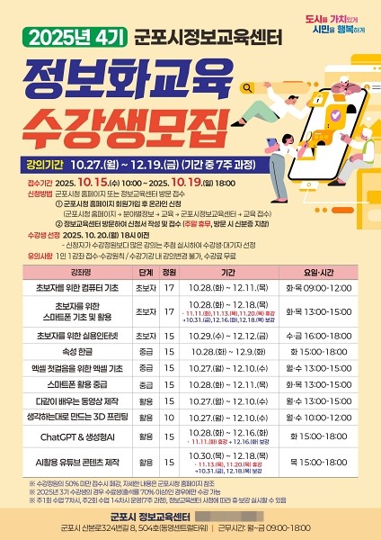 군포시는 시민들의 정보화 시대에 대한 적응 능력 향상 및 정보 소외 계층의 디지털 격차 해소를 위해 운영되는 ‘2025년 4기 시민정보화교육’의 수강생을 오는 15일부터 19일까지 모집한다.