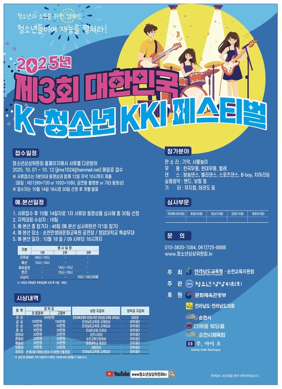 이번 대회는 지난 9월20일 "제8회 순천시 K-청소년 끼 경연대회"에서 수상한 16팀 119명(밴드 6팀, 보컬 2팀, 댄스 6팀, 국악 2팀)과 10월1일부터 12일까지 "제3회 대한민국 K-청소년 KKI 경연대회" 공모를 통해 선정된 11개 팀 127명(밴드 4팀, 댄스 4팀, 보컬 3팀)으로 구성된 총 27팀(총 246명)이 이번 경연대회를 통해 최종 수상자가 선정된다고 말했다.
