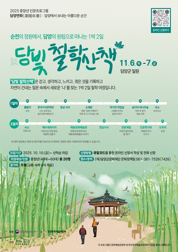 담양군문화재단(이사장 정철원, 이하 재단)은 문화체육관광부와 한국문화예술위원회에서 후원하는 2025 중장년 인문 프로그램의 일환으로, 자연이 건네는 질문 속에서 새로운 ‘나’를 찾는 1박 2일 철학 여정 ‘담빛 철학산책–담양편’ 참가자를 모집한다고 밝혔다.