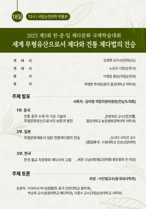 둘째 날인 18일 오후 1시에는 국립순천대학교 박물관에서 ‘제5회 한·중·일 제다문화 국제학술대회’가 열린다. ‘세계 무형유산으로서 제다와 전통 제다법의 전승’을 주제로 한국·중국·일본의 대표 연구자들이 제다문화를 학문적으로 비교·고찰한다.