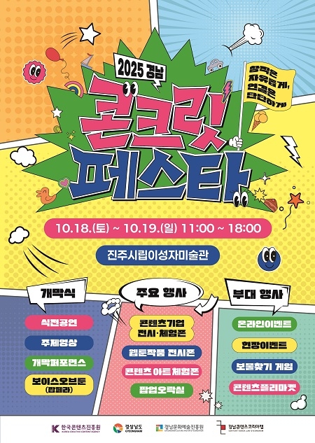 경남도와 경남문화예술진흥원은 도민들에게 경남 지역 콘텐츠 체험 기회를 제공하고, 콘텐츠 산업 저변을 확대하기 위해 오는 18~19일 이틀간 진주시립이성자미술관 일원에서 ‘2025 경남 콘크릿 페스타(CONCRETE FESTA)’를 개최한다고 16일 밝혔다.